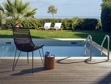They are located in front of the sandy beach of the hotel. They cover an area of approx. 55 m2 indoors, and approx 100m2 of private garden outdoor. They also possess a private swimming pool and fully equipped outdoor lounge are including sofa, armchairs sun beds etc.